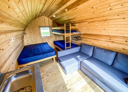 A glass of wine from the fridge, a bowl of nibbles and a star-filled sky to view from your pod whilst you sit and eat at your own decked outdoor seating area – does life get any better than this Inside is a comfortable sofa that converts into a double bed & 1 double bed at the back of the pod (sleeping 4). Outside there is a decked porch area with a picnic table & space to cook on a portable BBQ plate (rentable at reception).