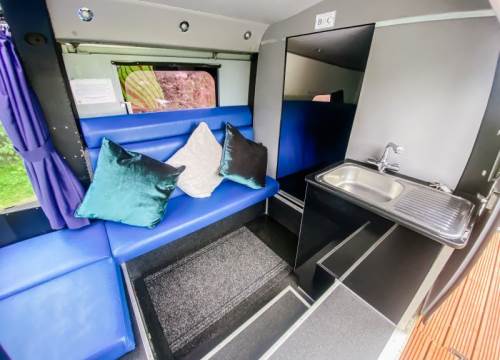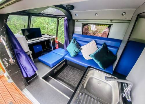 The Helicopter comfortably sleeps up to two adults and two children in a specially designed double ‘bunk’ at the rear tail, with a pull out sofa bed for the children in the main compartment. There is a small sink area with a kettle, microwave and mini fridge.