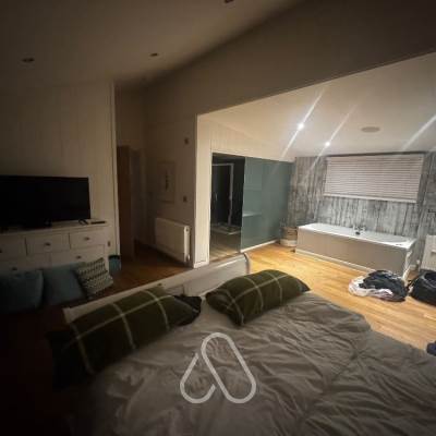 Main bathroom featuring double sinks and large walk in shower. Flat screen TV and dressing area in bedroom. Free standing bath in the bedroom. Spacious open plan lounge/dining area with contemporary kitchen. French doors leading out onto a decking area, enclosed garden area with outdoor hot tub. Integrated music sound system throughout.