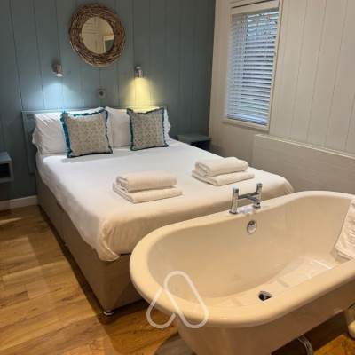 King sized four poster bed and free standing bath in the bedroom area, main bathroom also. Open plan living area with high quality kitchen, large flat screen TV / DVD and iPod dock. French doors leading onto a secure decking with outdoor hot tub.