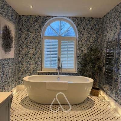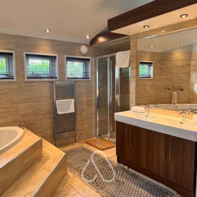Main bathroom featuring double sinks and large walk in shower. Flat screen TV and dressing area in bedroom. Free standing bath in the bedroom. Spacious open plan lounge/dining area with contemporary kitchen. French doors leading out onto a decking area, enclosed garden area with outdoor hot tub. Integrated music sound system throughout.