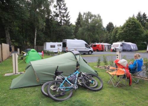 Our tent pitches are on a flat grass area and use of our toilet, shower and washing up facilities is included. Pet are welcome free of charge. Free fishing on the River Teviot and WiFi is available (chargeable).