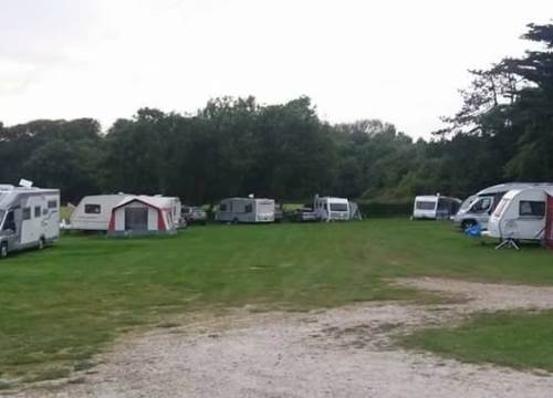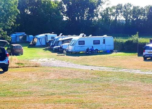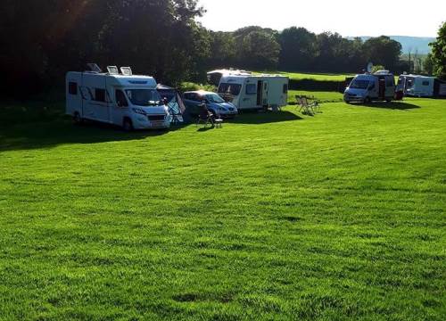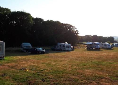 The Site is a Caravan Club affiliated site conforming to their rules and regulations. It is in a neatly-mown field off a private drive and is a partially sloping site bordered on three sides by trees. There are 40 spacious pitches mostly arranged around the edge of the field. Facilities include electrical hook-ups, Wifi, an information hut, two watering points and one chemical disposal point. THERE ARE NO SHOWERS OR TOILETS.
