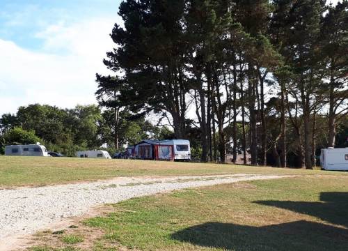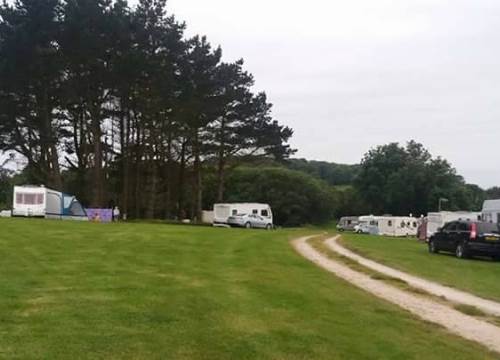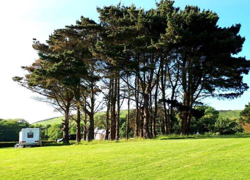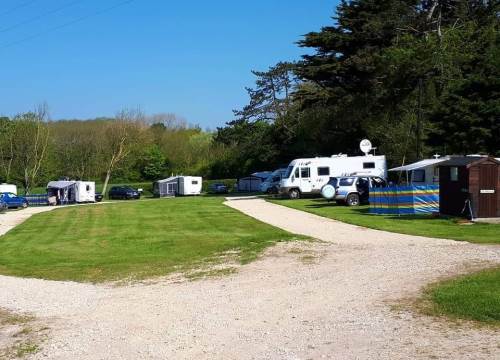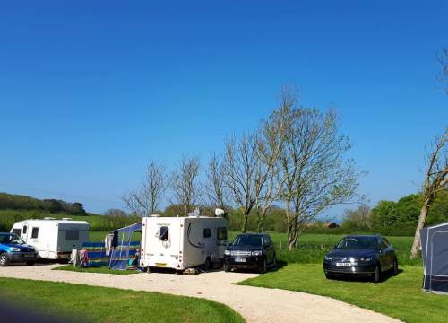Grass caravan pitches are in a quiet area next to a small wood at the very bottom of our site overlooking beautiful views of fields, hills and cliffs.