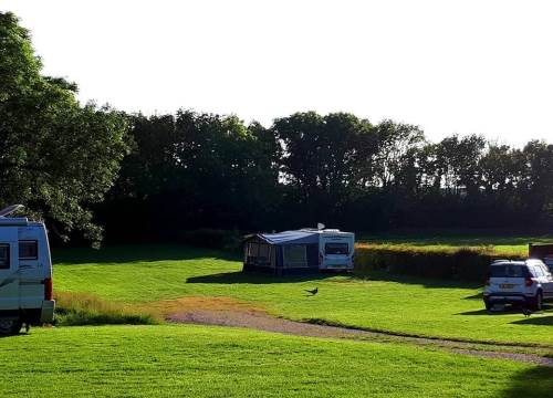 Grass pitches 14–17 are a row of caravan, camper or motorhome pitches along the bottom of our main field with a small wood beyond and views over the site of trees, fields, hills and cliffs. Watch the wildlife from your pitch.