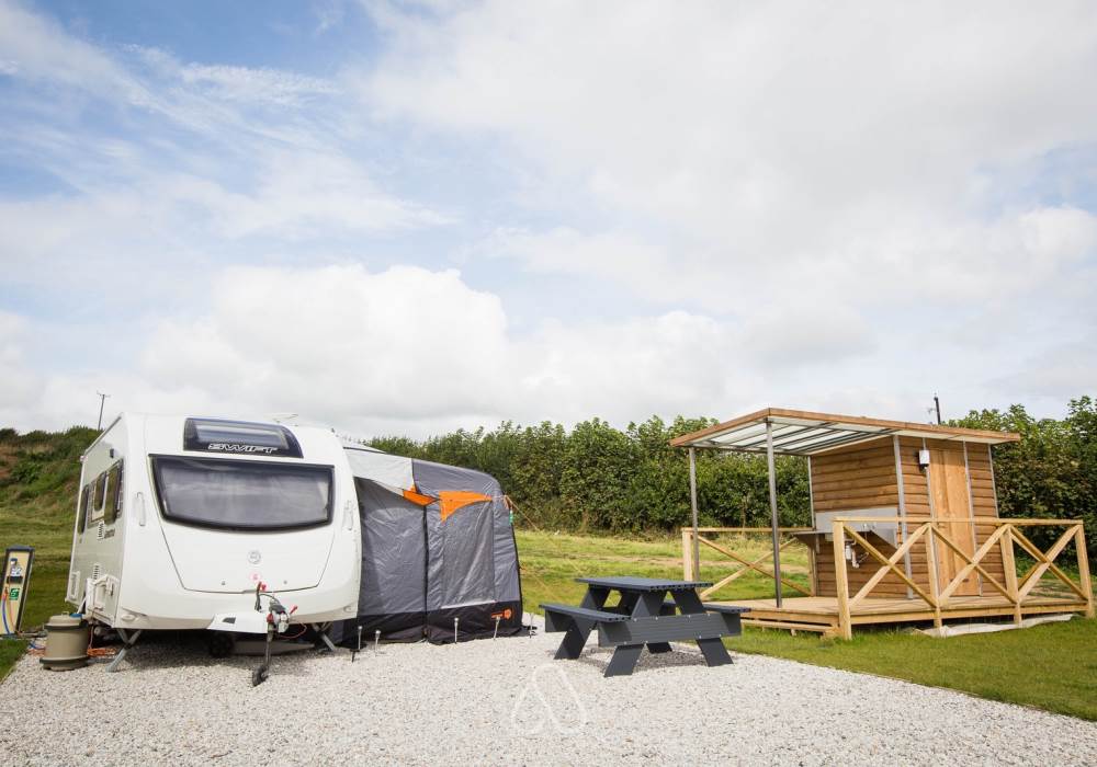 They also include 16amp electric hook up, water tap, TV point, grey water drainage and a picnic bench.