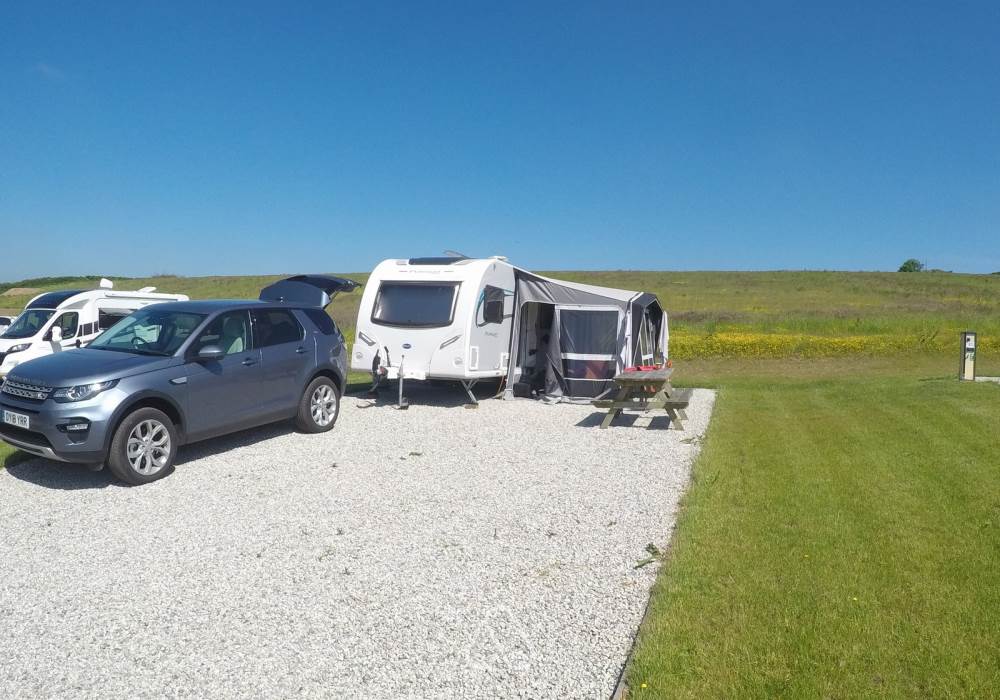 A gravel hardstanding pitch with grass alongside, with an average size of 10 x 10 metres including a 16amp electric hook-up.