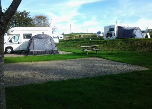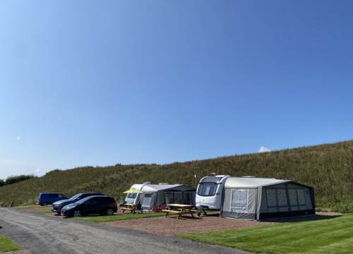 These pitches are 15 x 12 metres in size, the pea gravel is 8 x 5 metres with the rest of the pitch as grass. Included is a 16amp electric hook up and TV point.