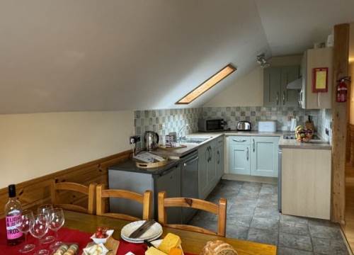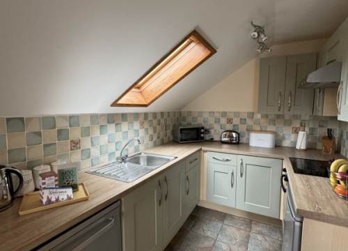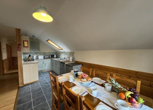 Walking up the steps you go on to a spacious decking area with your gas BBQ, outdoor furniture and large, private hot tub. From the decking you enter the lodge with it's large open plan living space. To the right is the living area which features a lounge with comfortable and modern upholstered sofas. To the left you find the dining area which has space to seat all six of you. From the dining area there is a fully equipped kitchen where you can prepare meals to enjoy in the lodge or picnics to take with you on your adventures.