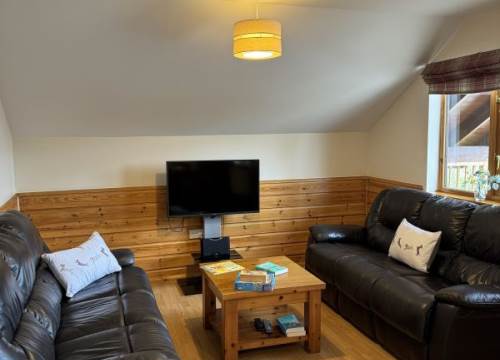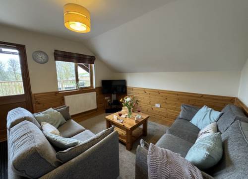 Walking up the steps you go on to a spacious decking area with your gas BBQ, outdoor furniture and large, private hot tub. From the decking you enter the lodge, to the left is the living area which features a lounge with comfortable and modern upholstered sofas. To the right you find the dining area which has space to seat all six of you. From the dining area there is a fully equipped kitchen where you can prepare meals to enjoy in the lodge or picnics to take with you on your adventures.