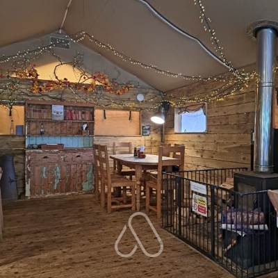 Willow's Hide comes with fresh running water, a fully equipped kitchen, free Wi-Fi, comfy beds and a bathroom with a flushing toilet and shower. The tent itself can sleep a family of 6 between two double bedrooms and a cupboard bed. Use of electric and gas is inclusive, and all the bed linen and towels are provided. Guests will need to bring their own washing up liquid, bin bags etc