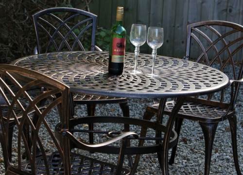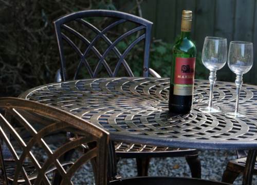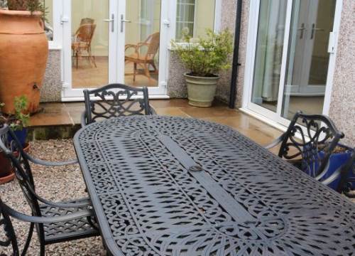 Outside – private patio garden with table and chairs, access via patio doors from lounge, dining area, conservatory and side gate.