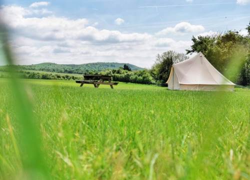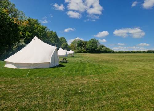 'Bell Tent - Top Field' (one of those labelled 5, 6, 7 and 8 on the map), is located 1 minute from the facilities and next to the play trail. These tents are only available from 23rd May 2025, whereas 1-4 are available from 2nd May 2025.