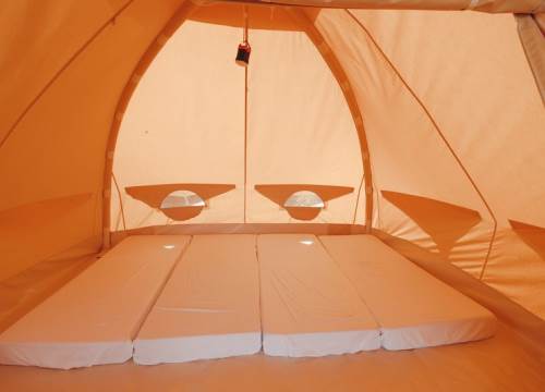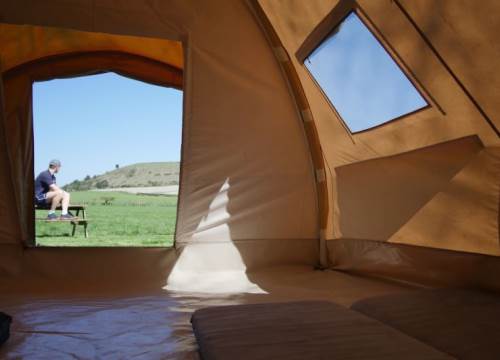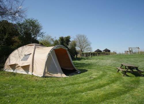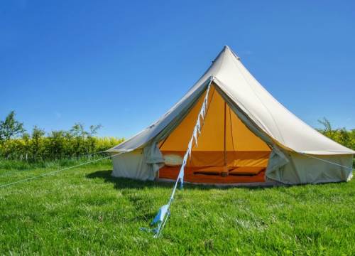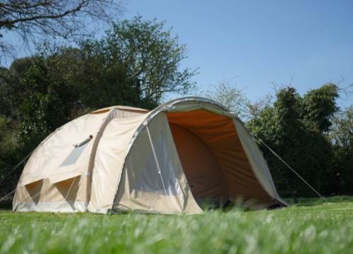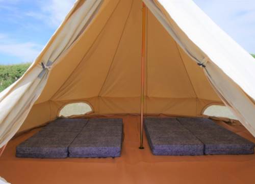We have 2 Karsten Tents which are ready pitched (not moveable). Each tent measures 3.5m square plus a small awning for shoes & bags. The tents comfortably sleep 4 people. The tents include 4x single mattresses and a battery powered lantern. There’s also a picnic bench outside. Remember: You need to bring your own bedding, linen, cooking equipment etc.