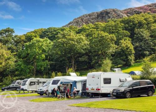 Grass pitch with electric hook up, water point and gravel under. Suitable for caravan & motorhomes.