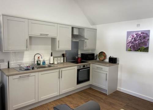 Inside, the open-plan layout features a vaulted ceiling, a fully fitted kitchen with a fridge, hob, oven and dishwasher, plus a sleek modern bathroom with a walk-in shower.