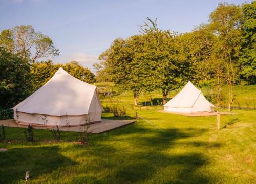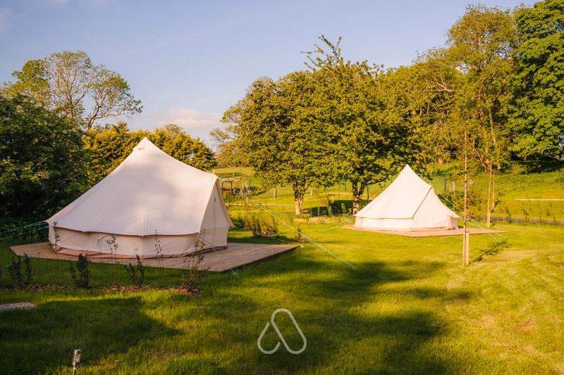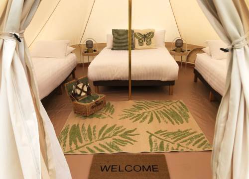 Sleeps max 4 people, this can be made up of adults & children. Our 5m Bell Tents have 1 double and 2 single beds.