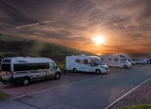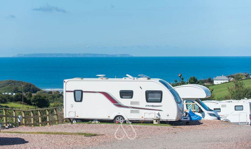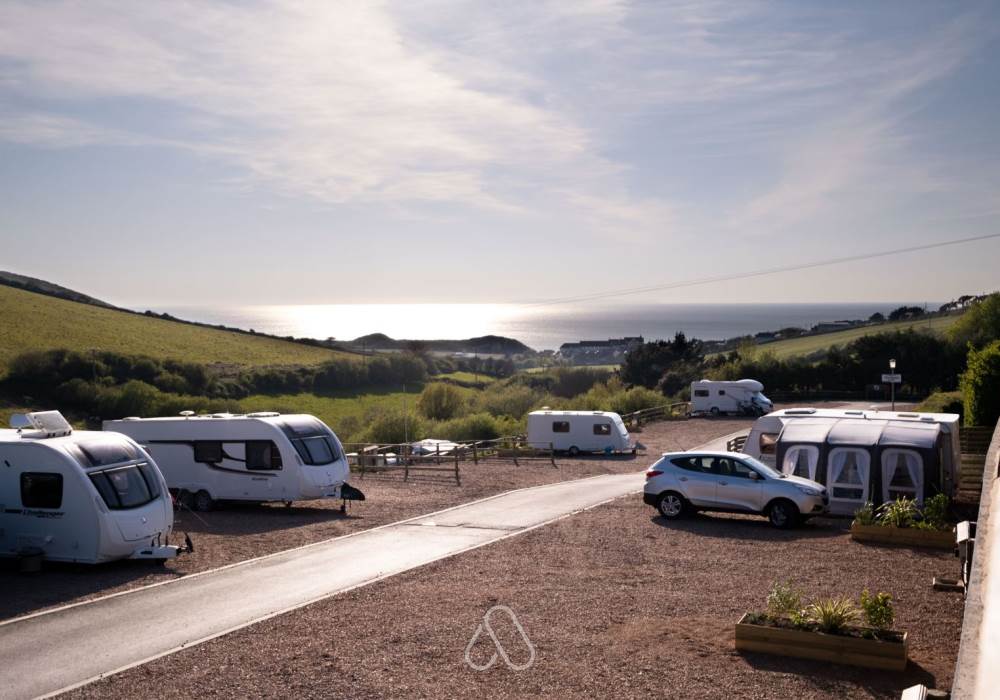 Super Hard Standing Pitches with electric point, lighting, TV point, water tap, drainage and sea or countryside views.