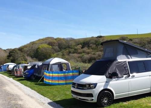 Grass Basic Pitch with sea views. These non-electric pitches will accommodate either a 4 berth tent and car or small camper van. Please call before booking if you wish to request specific pitch sizes.